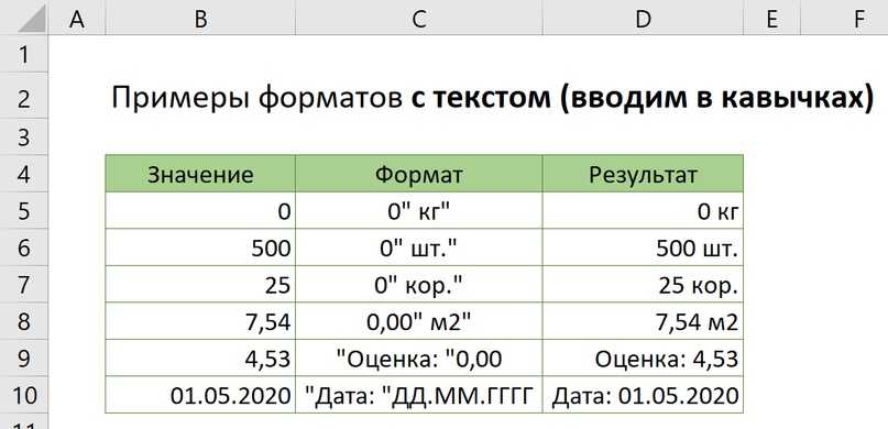Чтобы отобразить оба текста вместе с цифрами, заключите текст в двойные кавычки («»). Вы можете использовать этот подход для добавления или добавления текстовых строк в формате пользовательского номера, как показано в таблице ниже.