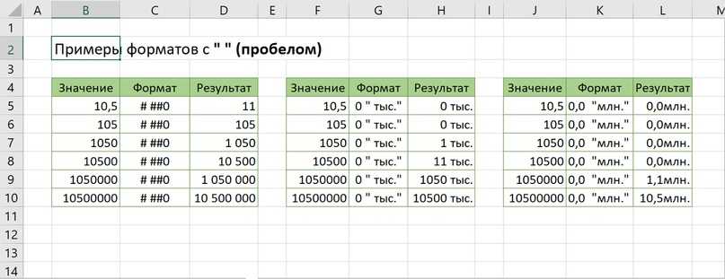 Пробел ( ) является заполнителем для тысяч разделителей в отображаемом числе. Его можно использовать для определения поведения цифр по отношению к тысячам или миллионам цифр.