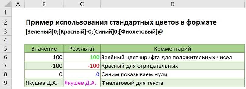 Существует два способа определения цвета в формате ячеек. Самый распространённый вариант – написать в квадратных скобках название цвета. Excel знает следующие 8 цветов по имени в цифровом формате: