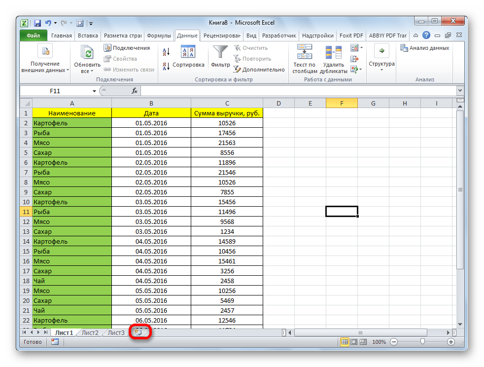 - После того как мы произведем приведение информации из разных рабочих областей к единому форматированию, нам необходимо реализовать создание нового рабочего листа. Сделать это можно путем нажатия левой клавиши мышки на небольшой плюсик темного цвета, расположенный в нижней части интерфейса табличного редактора рядом со вкладками других листов.