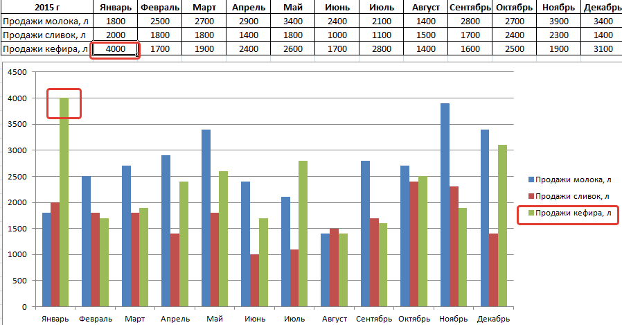 Если мы будем вносить в таблицу изменения, внешний вид гистограммы тоже будет меняться. Для примера вместо 1400 в январе по кефиру поставим 4000. Видим, как зеленый столбец полетел вверх.