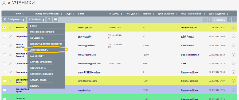 Зайдем в модуль Ученики, выделим несколько учеников установив флажок напротив необходимой записи зайдем в Действие и выберем Экспортировать.