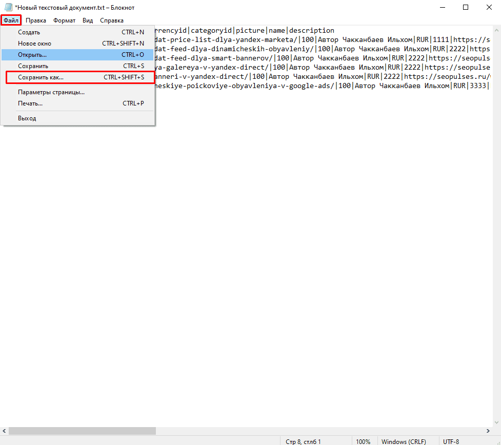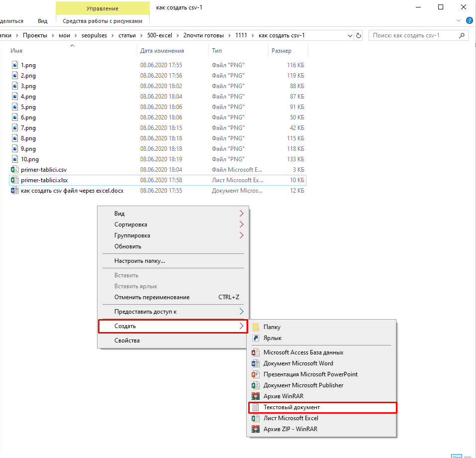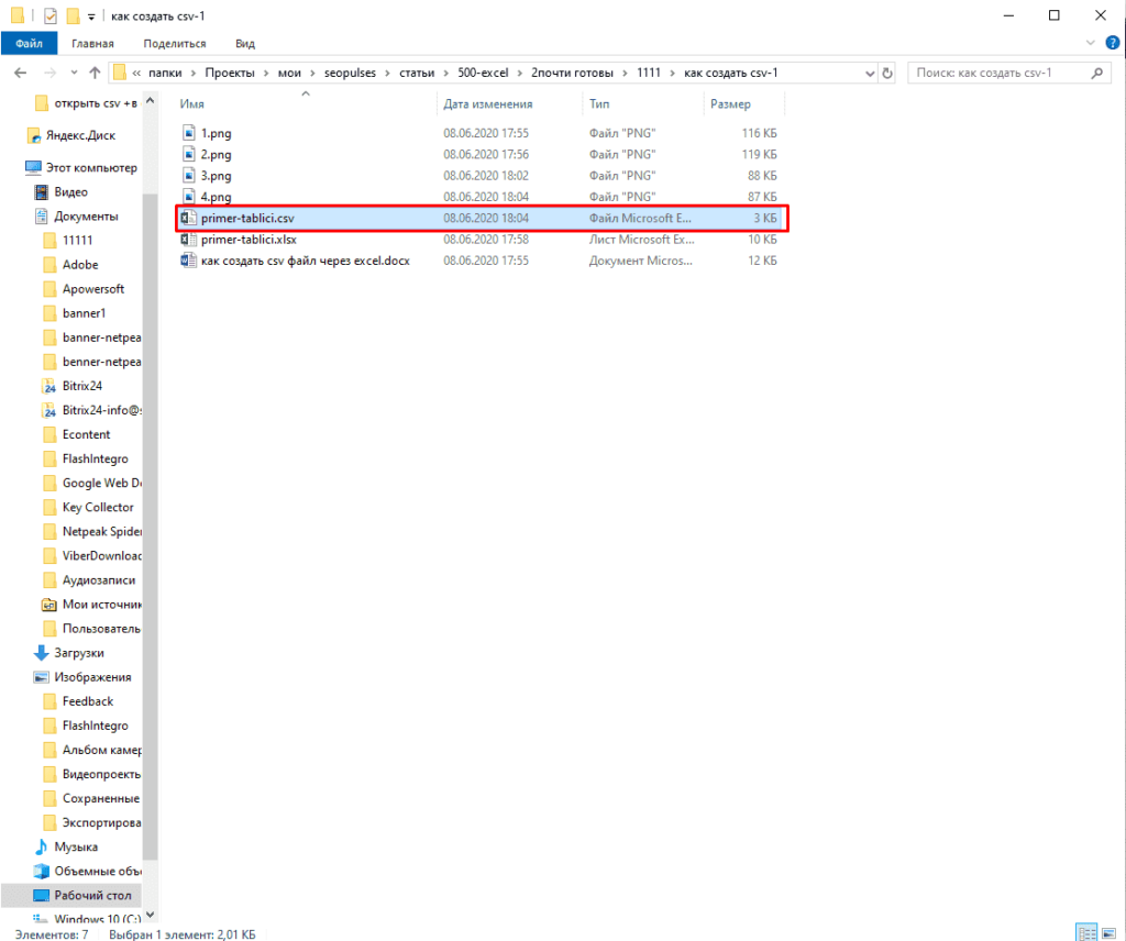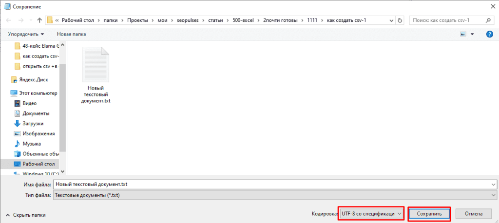 Ручной метод превращения таблицы Эксель в CSV-файл