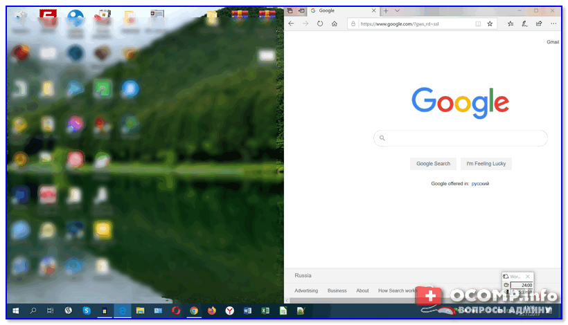 Windows также автоматически изменит ширину окна у Word и разместит его слева — граница между двумя окнами в итоге будет ровно по середине (причем, с привычкой делается это очень быстро — буквально за несколько секунд. Никакая мышка не позволит обогнать горячее сочетание клавиш. ) .
