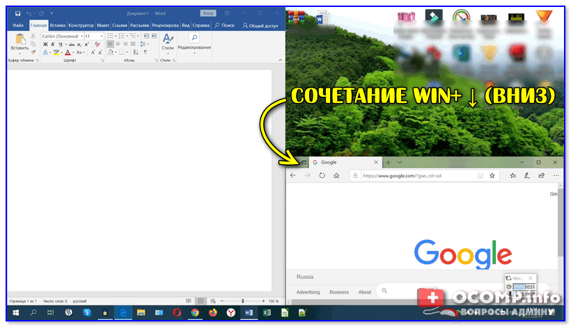 Если на экране нужно разместить 3 окна (или 4) — выберите то окно программы, которое можно еще раз ополовинить, и нажмите сочетание Win + ↓ (стрелка вниз) . В результате выбранное окно разместится ровно в нижнем углу, а верхний — останется для нового приложения.