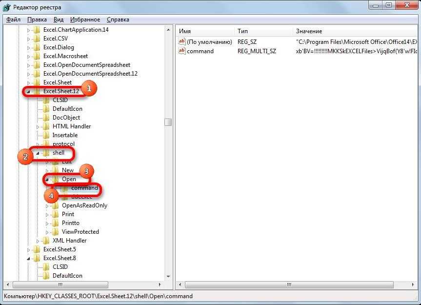 Перейдем в раздел реестра HKEY_CLASSES_ROOTExcel.Sheet.8shellOpencommand