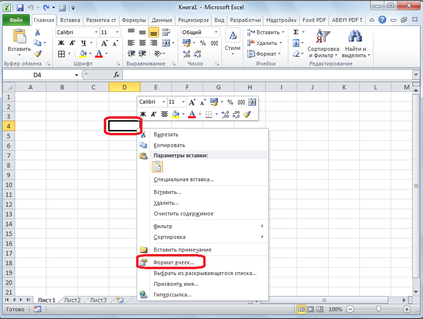 - Кликаем правой кнопкой мыши по нужной ячейке, и в появившемся контекстном меню выбираем пункт «Формат ячеек…». Или же, набираем на клавиатуре сочетание клавиш Ctrl+1.