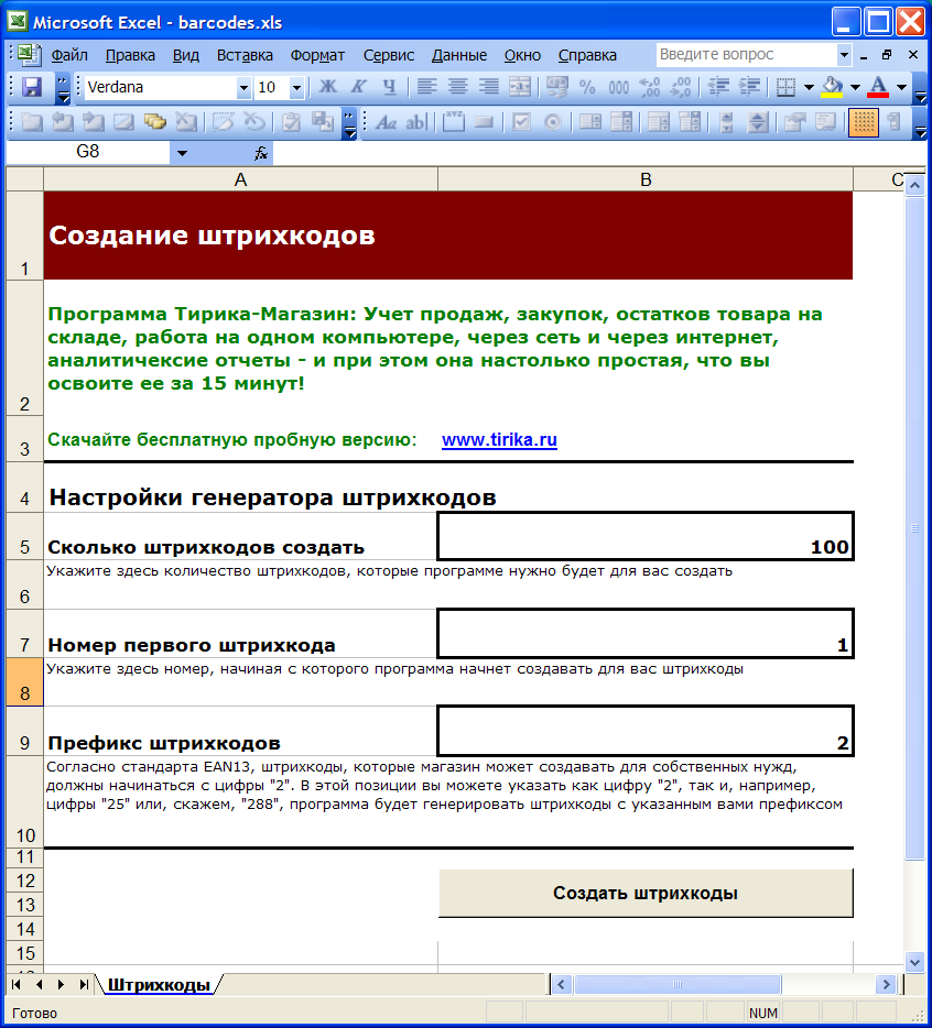 Генератор штрих-кода, который вы сейчас читаете, также представляет собой файл Excel со встроенными макросами. Мы знаем, что в этом файле нет вредоносного кода (вообще наша задача продать вам программу Тирика-Шоп в итоге и не заразить ваш компьютер), но верить этим словам — ваше дело. Если вы решили нам не доверять, то можете прекратить чтение этой статьи и удалить скачанный файл: к сожалению, без макросов загруженный вами файл для генерации штрих-кодов работать не будет.