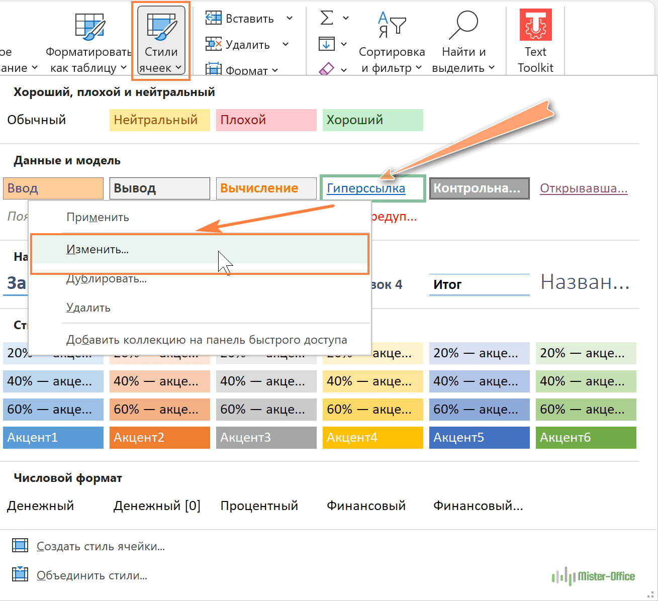 - Щелкните правой кнопкой мыши на кнопке «Гиперссылка», чтобы изменить внешний вид. Или щелкните правой кнопкой мыши на «Открывавшаяся гиперссылка», если нужно изменить вид ссылок, по которым уже переходили.