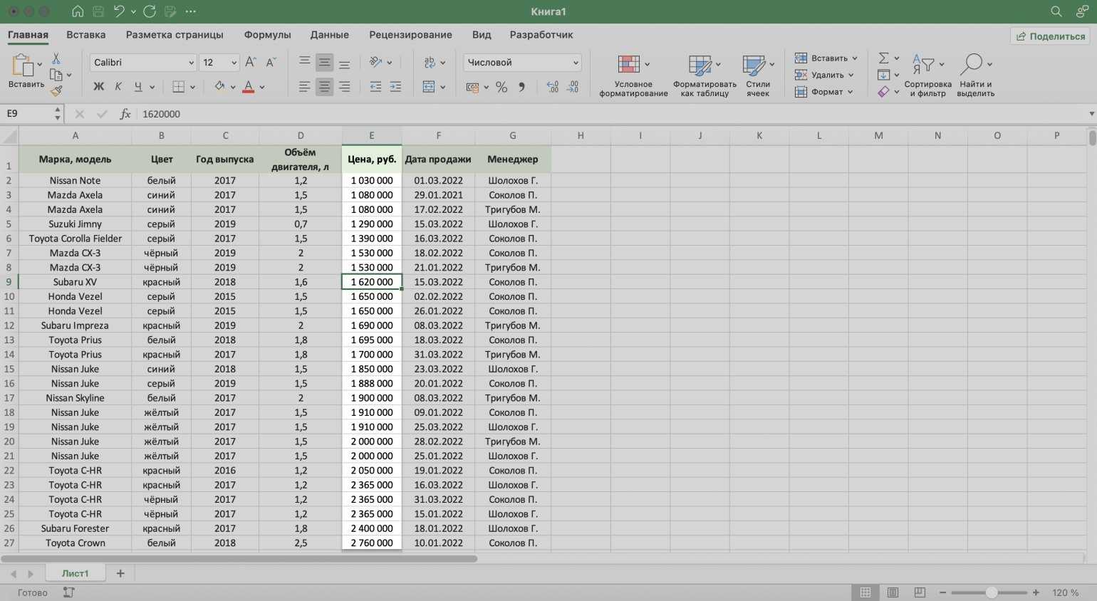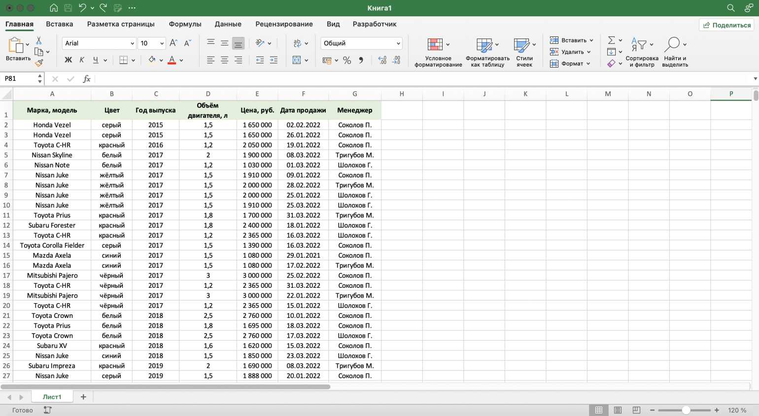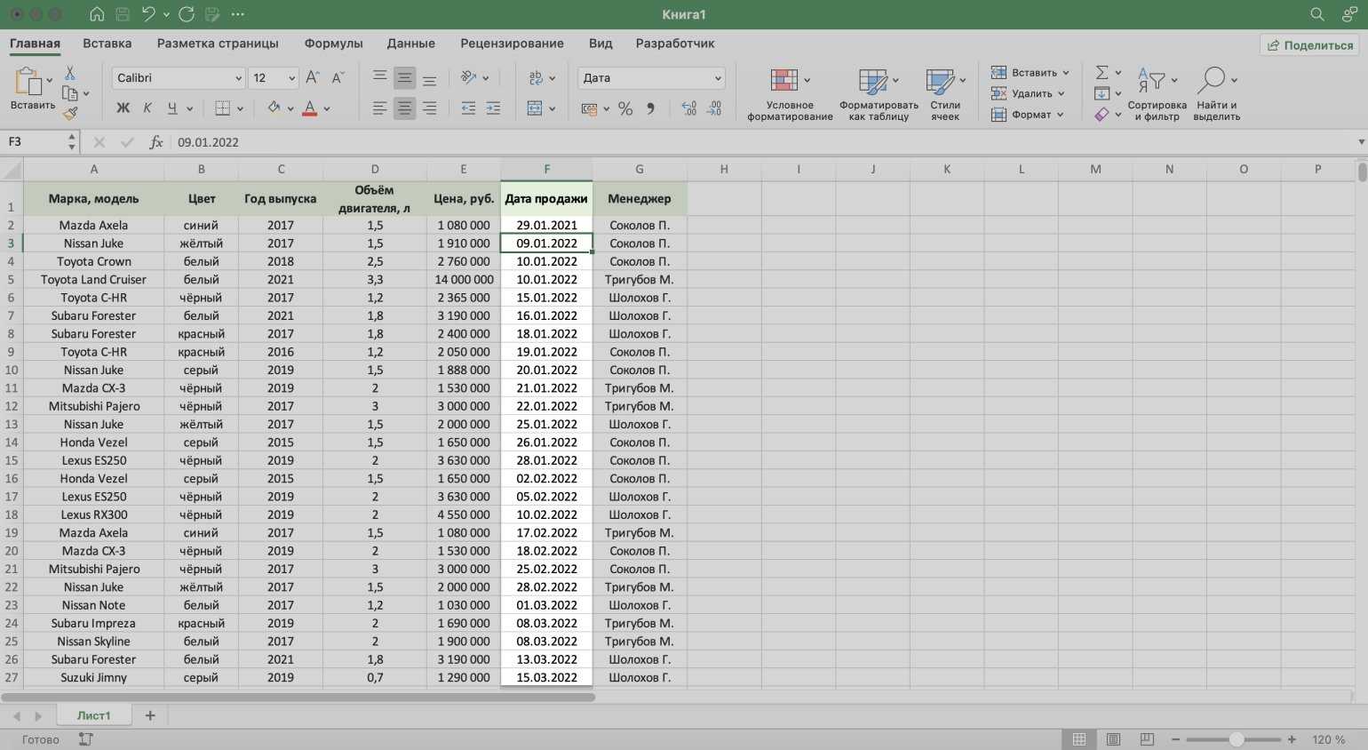 Воспользуемся отчётом небольшого автосалона. В таблице собрана информация о продажах: характеристики авто, их цена, дата продажи и ответственные менеджеры. Данные расположены беспорядочно.