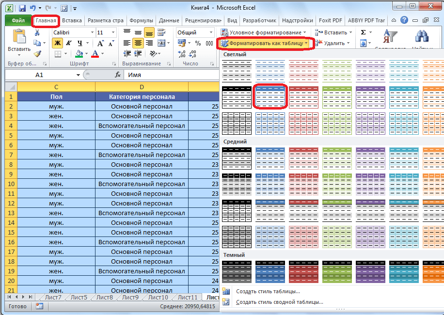 Существует два способа создания «умной таблицы». Для того, чтобы воспользоваться первым из них, выделяем всю область таблицы, и, находясь во вкладке «Главная», кликаем по кнопке на ленте «Форматировать как таблицу». Данная кнопка находится в блоке инструментов «Стили».