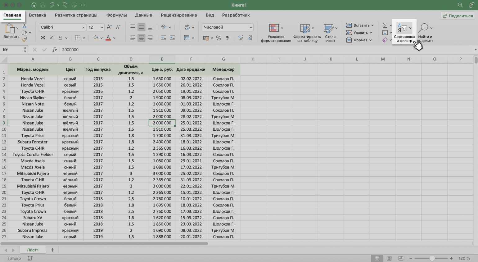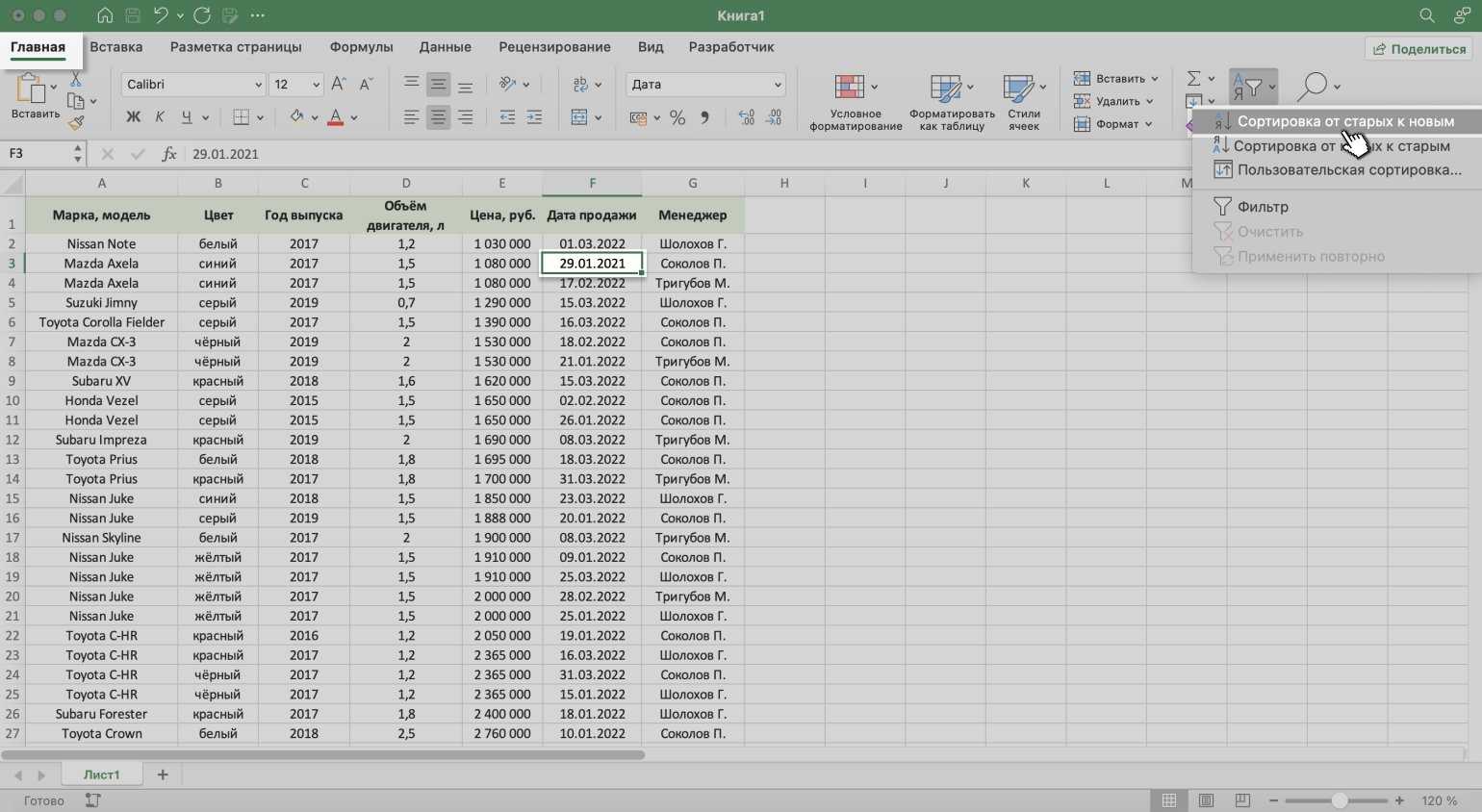 Для примера отсортируем данные по возрастанию цены автомобилей, по дате их продажи и по фамилиям менеджеров.