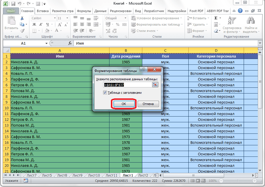 Главное, обратите внимание, чтобы около параметра «Таблица с заголовками» стояла галочка. Далее, просто нажать на кнопку «OK»