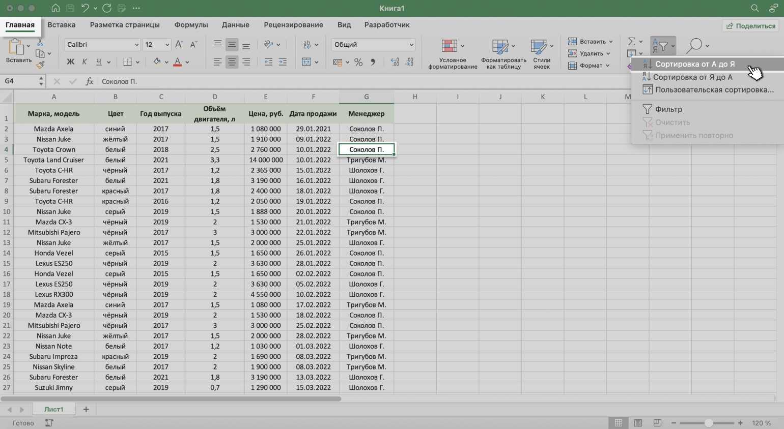 Сортируем данные по фамилиям менеджеров. Выделяем любую ячейку в столбце «Менеджер», нажимаем кнопку «Сортировка и фильтр» и выбираем нужный тип сортировки. В нашем примере отсортируем по алфавиту — выберем пункт «Сортировка от А до Я».