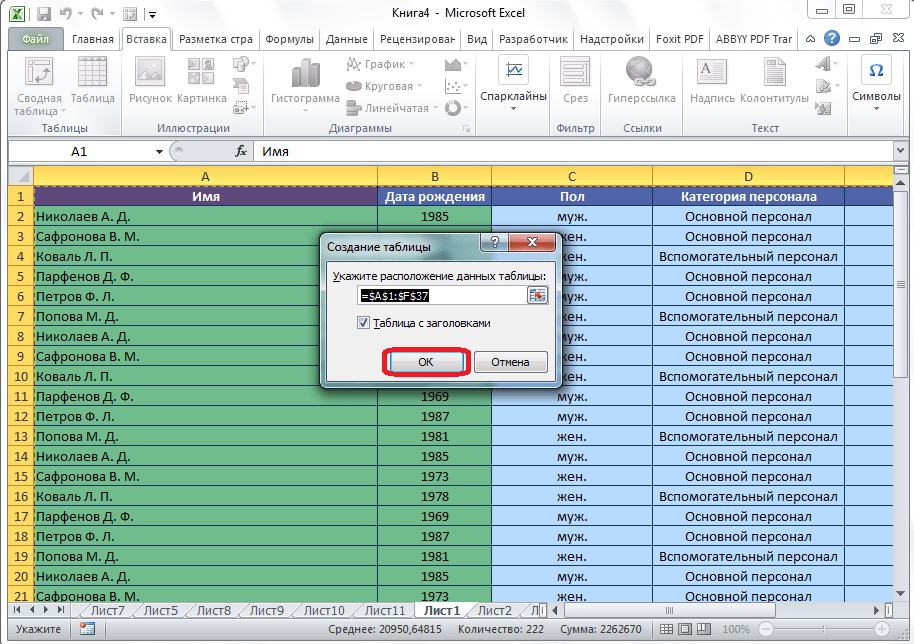 Если вы решили воспользоваться вторым способом, тогда тоже нужно выделить всю область таблицы, но на этот раз перейти во вкладку «Вставка». Находясь тут, на ленте в блоке инструментов «Таблицы», следует нажать на кнопку «Таблица».