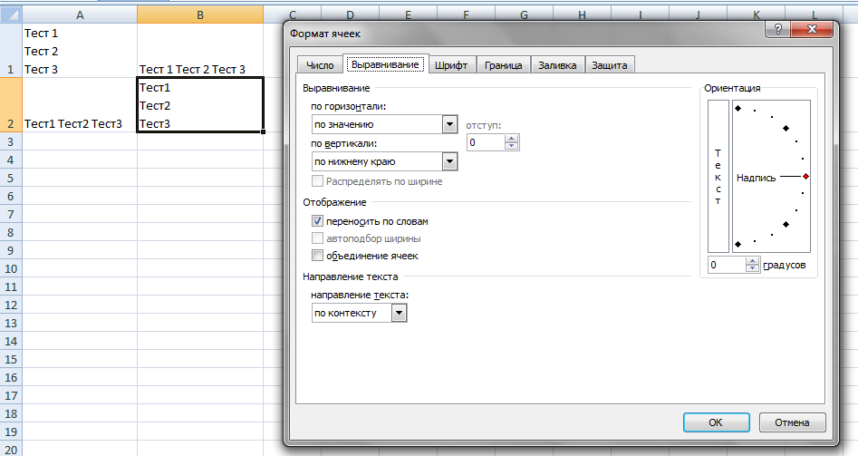 Обратите внимание! Чтобы перенос строки корректно отображался необходимо включить «перенос по строкам» в свойствах ячейки. Для этого выделите нужную нам ячейку (ячейки), нажмите на правую кнопку мыши и выберите «Формат ячеек. В открывшемся окне во вкладке «Выравнивание» необходимо поставить галочку напротив «Переносить по словам» как указано на картинке, иначе перенос строк в Excel не будет корректно отображаться с помощью формул