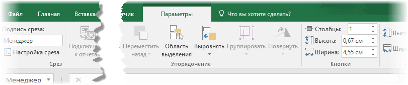 Для настройки самого среза на ленте также появляется контекстная вкладка Параметры. В ней можно изменить стиль, размеры кнопок, количество колонок и т.д. Там все понятно.