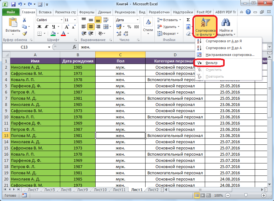 Фильтр устанавливается на заголовки и подзаголовки таблиц; главное, чтобы ячейки, на которые будет устанавливаться фильтр, не были пустыми. А располагается он в меню книги Excel на вкладке «Данные», раздел «Сортировка и фильтр»: