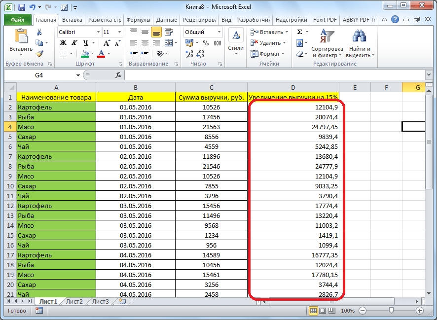 Как видим, результат умножения чисел на определенный процент выведен и для других ячеек в колонке.
