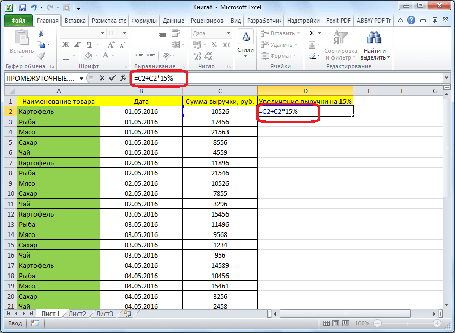 Прежде всего, выбираем ячейку, куда будет выводиться результат. Ставим в ней знак «=». Далее, кликаем по ячейке, содержащей данные, к которым следует прибавить процент. Ставим знак «+». Опять кликаем по ячейке, содержащей число, ставим знак «*». Далее, набираем на клавиатуре величину процента, на который следует увеличить число. Не забываем после ввода данной величины ставить знак «%».