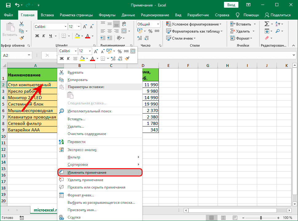 - Правой клавишей мыши щелкаем по ячейке с комментарием. В открывшемся списке кликаем по команде “Поменять примечание”.