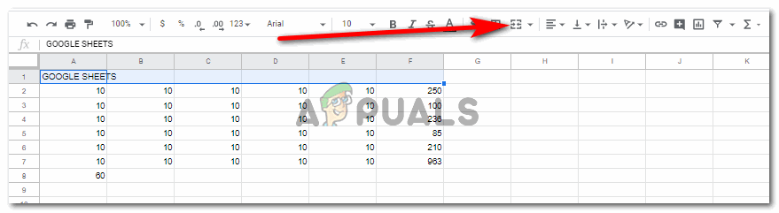 - На верхней панели инструментов для Google Sheets вы найдете вкладку для слияния, которая выглядит как две квадратные скобки и стрелки в центре. Посмотрите на изображение ниже, чтобы узнать, как выглядит вкладка для ячеек слияния в Google Sheets.