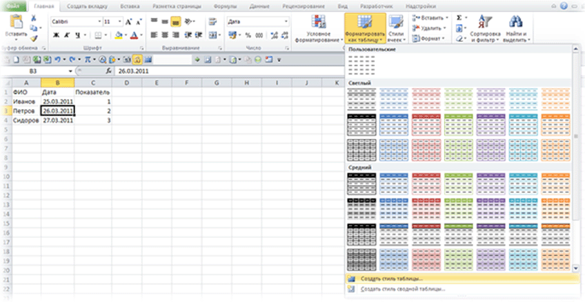 Шаг 2: Выделив нашу таблицу или хотя бы одну ячейку в ней (если в таблице нет пустых строк, столбцов или диапазонов) заходим во вкладку ленты «Главная» и выбираем в группе «Стили» меню «Форматировать как таблицу». Далее выбираем стиль из имеющихся или создаём свой.