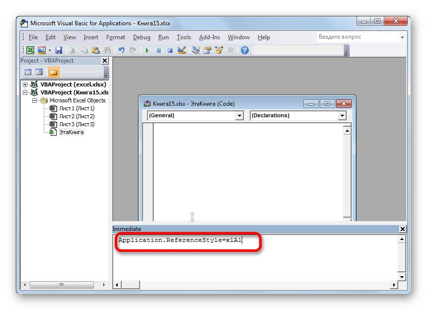 - Открывается редактор VBA. Жмем на клавиатуре сочетание клавиш Ctrl+G. В открывшееся окно вписываем код: Application.ReferenceStyle=xlA1