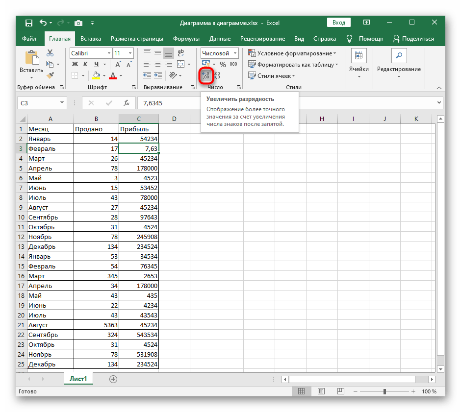 Самый простой и быстрый способ отключения округления чисел в Excel — использование функции «Увеличить разрядность». Она работает по принципу увеличения отображения чисел после запятой до необходимого количества, а для использования понадобится выполнить пару действий.