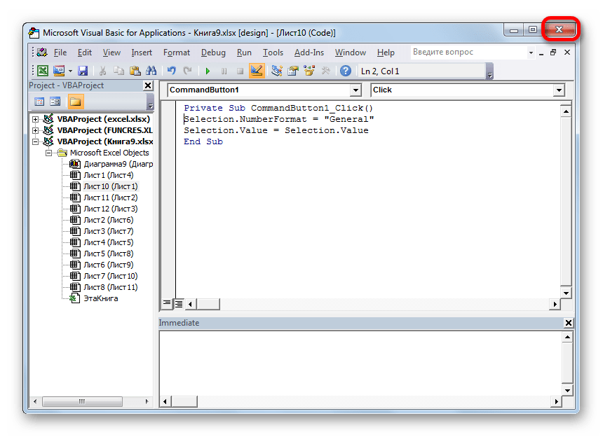 Кликните дважды по кнопке из коллекции «Элементы ActiveX» левой кнопкой мыши в режиме конструктора. Это приведет к открытию модуля листа, на который вставлена кнопка, и записи шаблона процедуры «CommandButton1_Click».