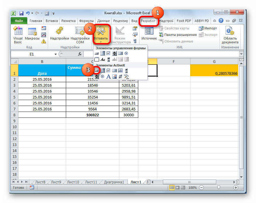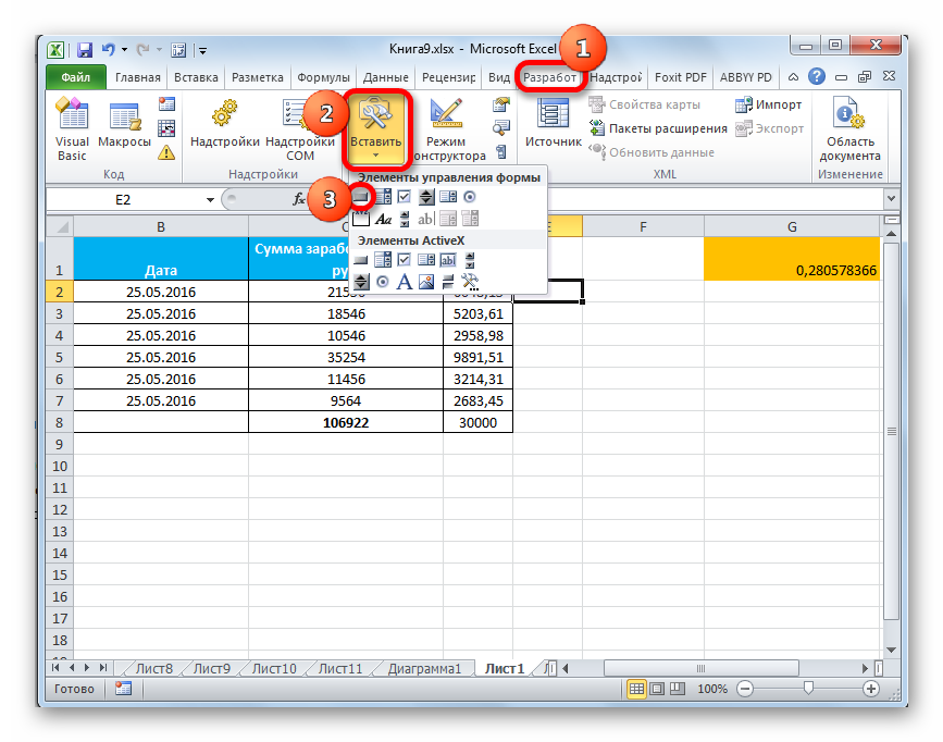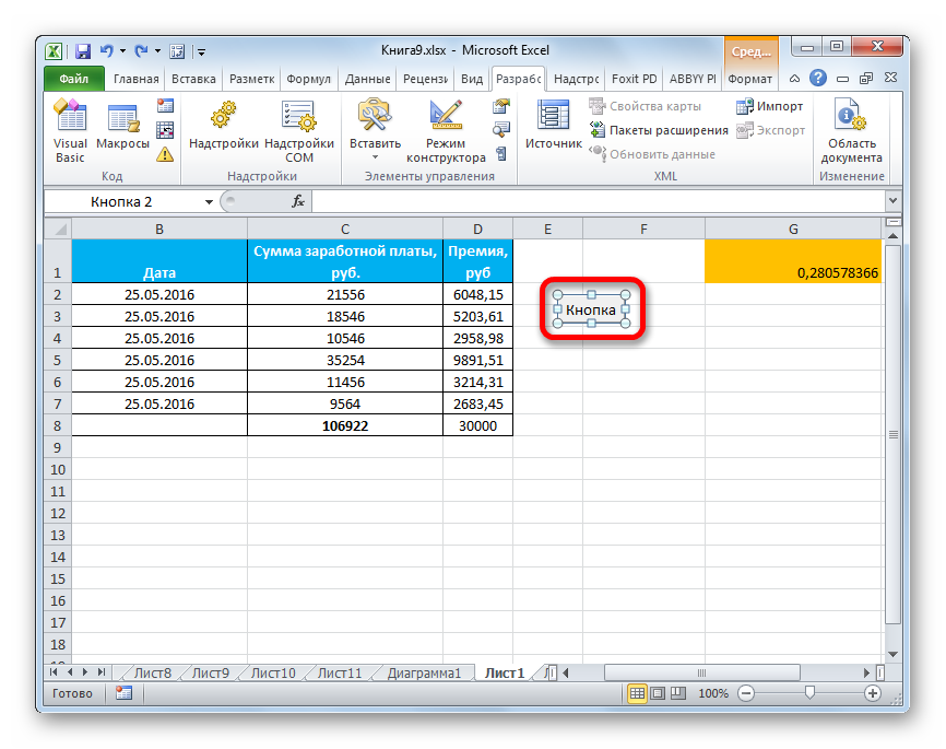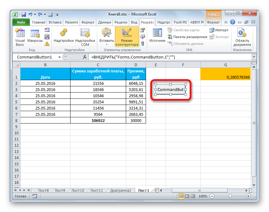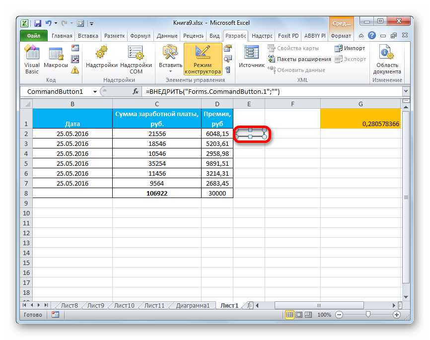 Следующий способ очень похож по технологии выполнения на предыдущий вариант. Он представляет собой добавление кнопки через элемент управления формы. Для использования этого метода также требуется включение режима разработчика.