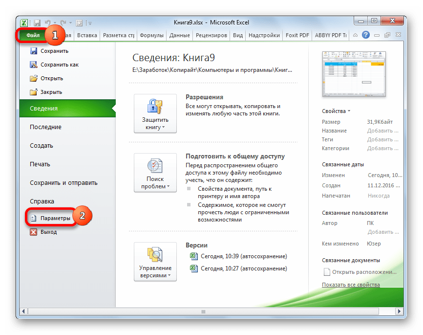 - Для того чтобы иметь возможность работать с элементами ActiveX, прежде всего, нужно активировать вкладку разработчика. Дело в том, что по умолчанию она отключена. Поэтому, если вы её до сих пор ещё не включили, то переходите во вкладку «Файл», а затем перемещайтесь в раздел «Параметры».