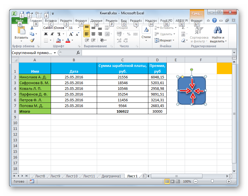 - На листе таблицы появится выбранный элемент. Изначально он вряд ли будет подходящей формы, поэтому переместите его в нужную область листа (в какую-нибудь ячейку) и измените размер, используя специальные маркеры на четырех сторонах прямоугольника.