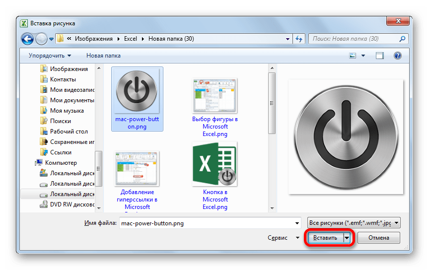 - Откроется окно файлового менеджера «Проводник». В нем необходимо перейти в папку с картинкой кнопки, выделить ее и нажать «Вставить».