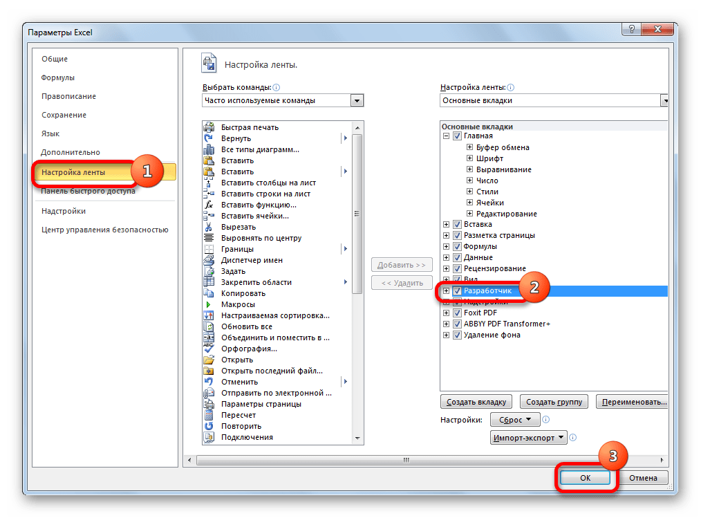 - Включите панель «Разработчика». Для этого в параметрах в разделе «Настройка ленты» поставьте галочку напротив пункта «Разработчик».