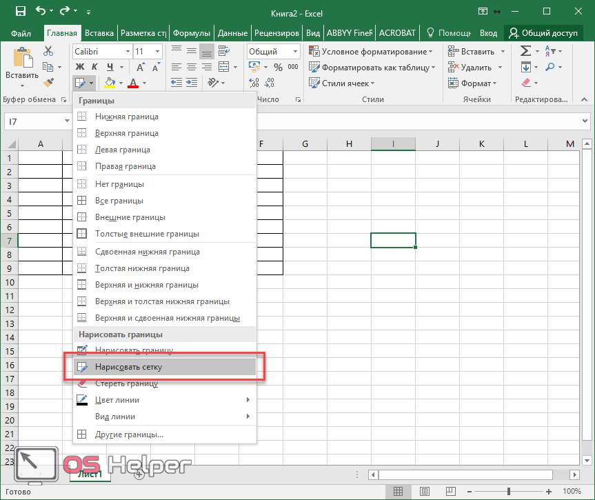 нажмите иконку «Границы» и выберите пункт меню «Нарисовать сетку».