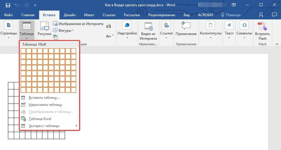 В Word 2010 максимальный размер таблицы, которую можно создать с помощью такого меню, составляет 10 на 8. Если этого недостаточно для вашего кроссворда, то выберите пункт меню «Вставить таблицу» .