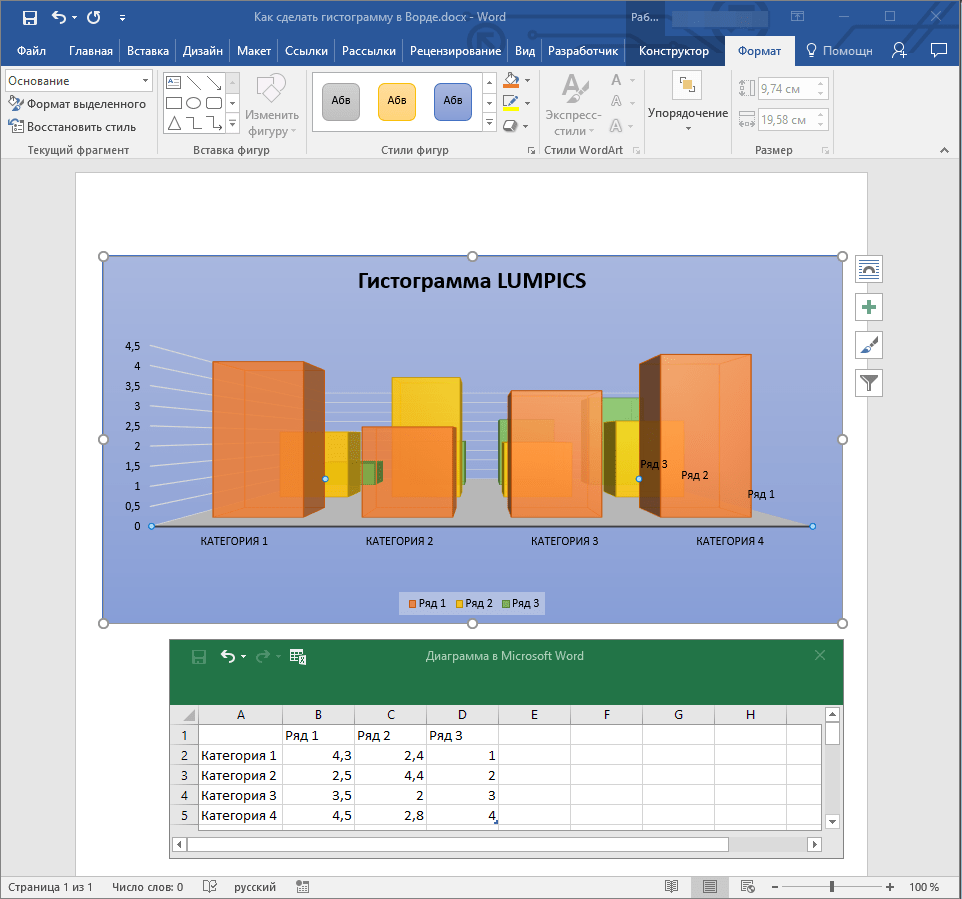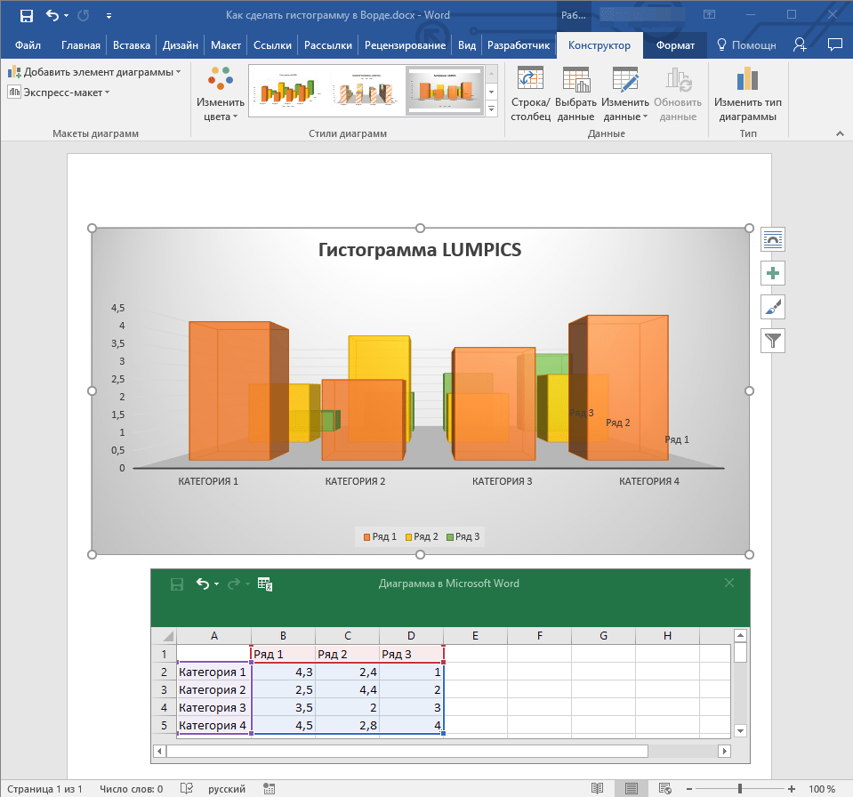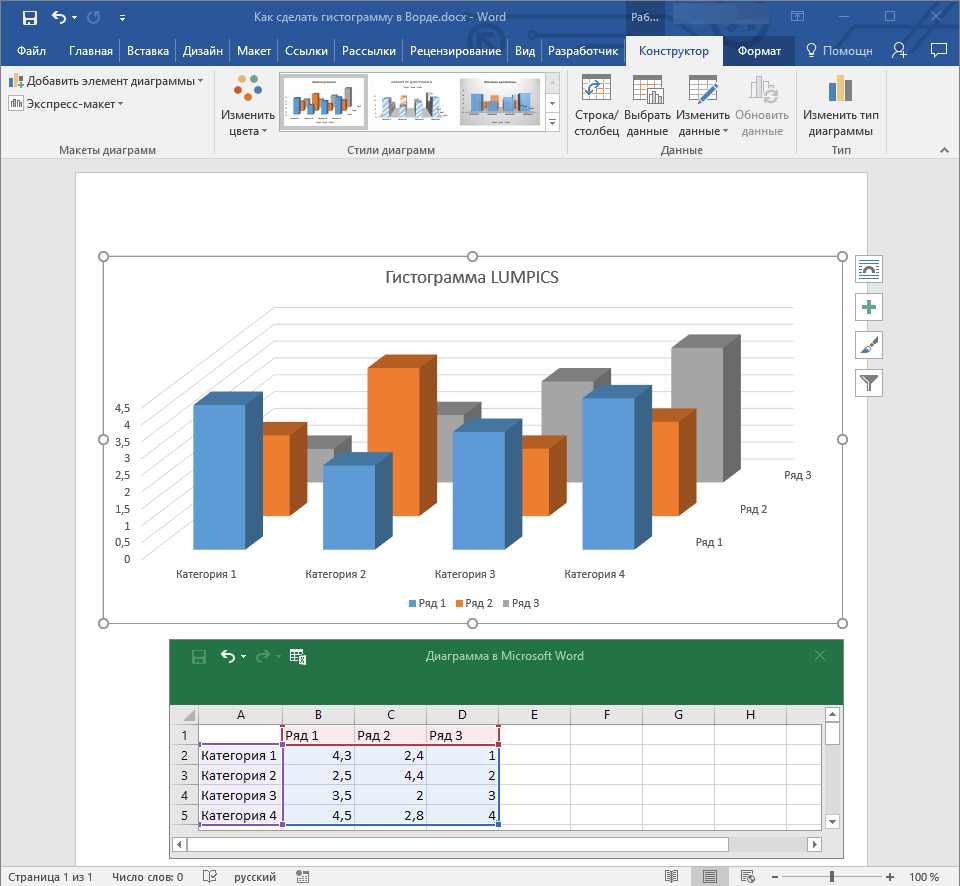 Кликнув на гистограмму, вы активируете основной раздел “Работа с диаграммами”, в котором есть две вкладки “Конструктор” и “Формат”.