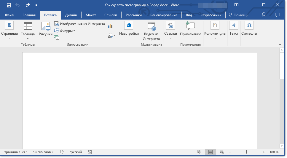 1. Откройте документ Word, в котором необходимо построить гистрограмму и перейдите во вкладку “Вставка”.