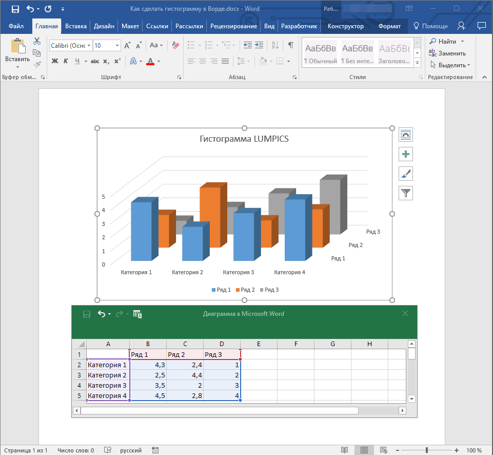 5. Гистограмма вместе с небольшой таблицей Excel будет добавлена в документ.