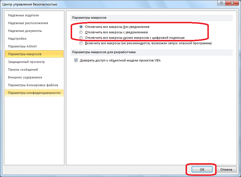 - Отключить все макросы без уведомления;