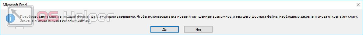 - Затем вы увидите следующее окно, в котором будет говориться о результатах преобразования. Вам предложат закрыть и снова открыть только что созданную книгу. Нажмите на кнопку «Да».