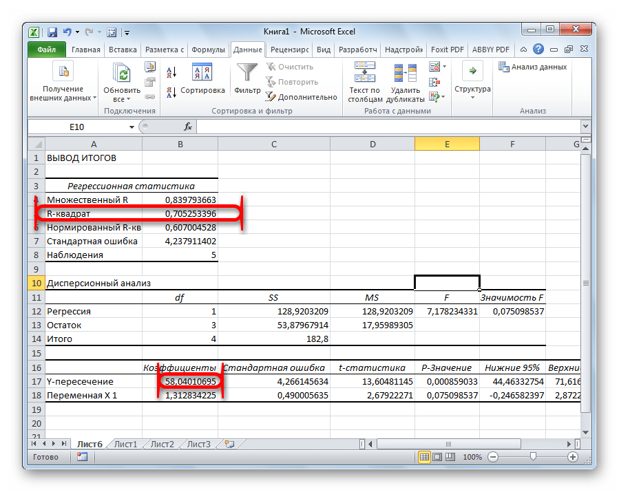 В первую очередь обращаем внимание на R-квадрат и коэффициенты. R-квадрат – коэффициент детерминации
