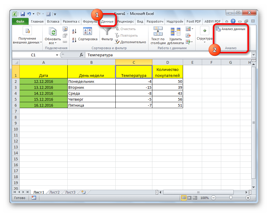 Во вкладке Данные в группе Анализ появится новая кнопка Анализ данных.