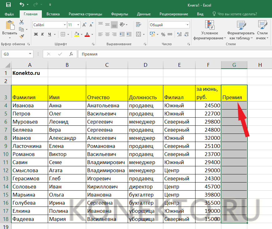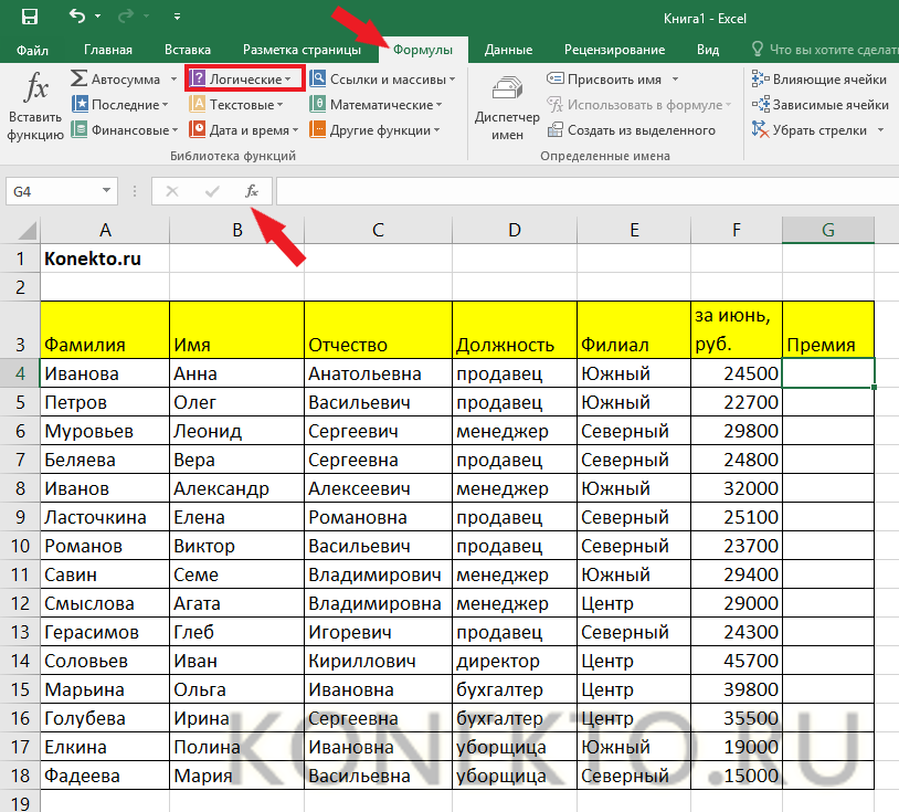 Добавляем столбец «Премия» — в него выводим результаты функции ЕСЛИ. Курсор ставим в ячейку G4.