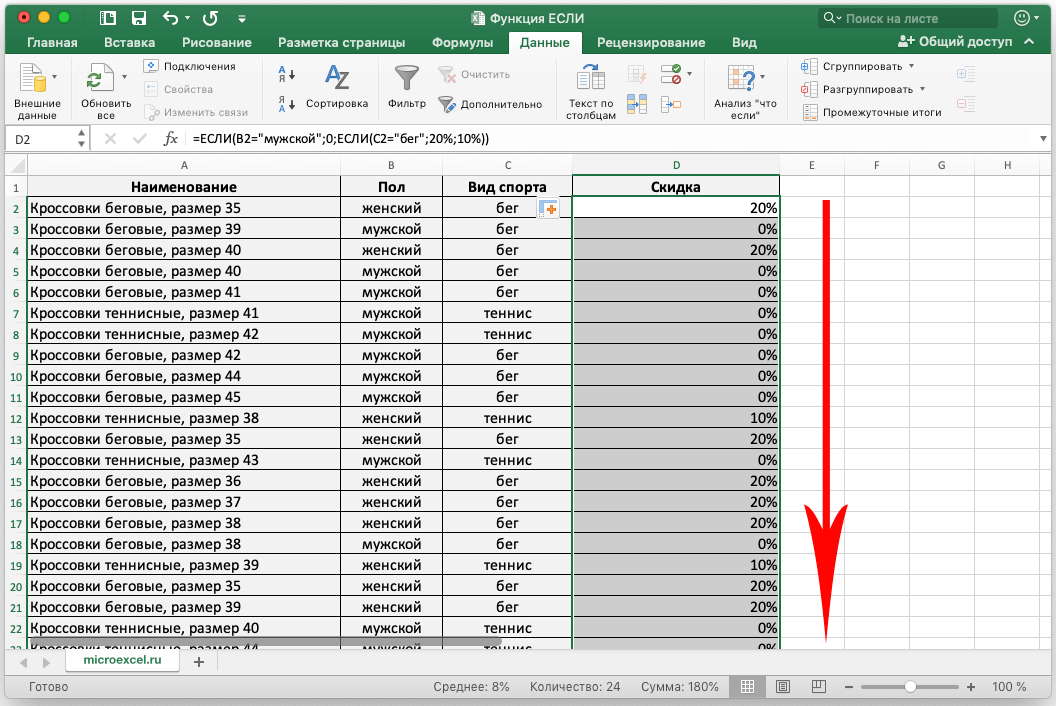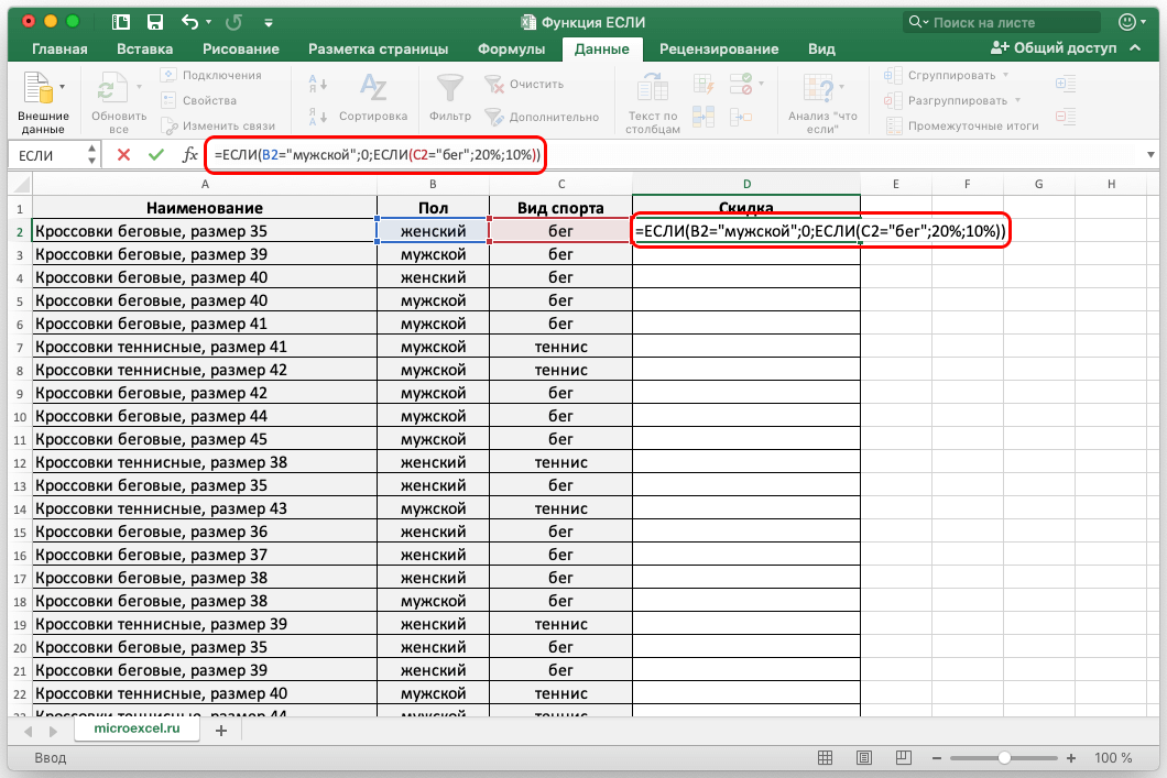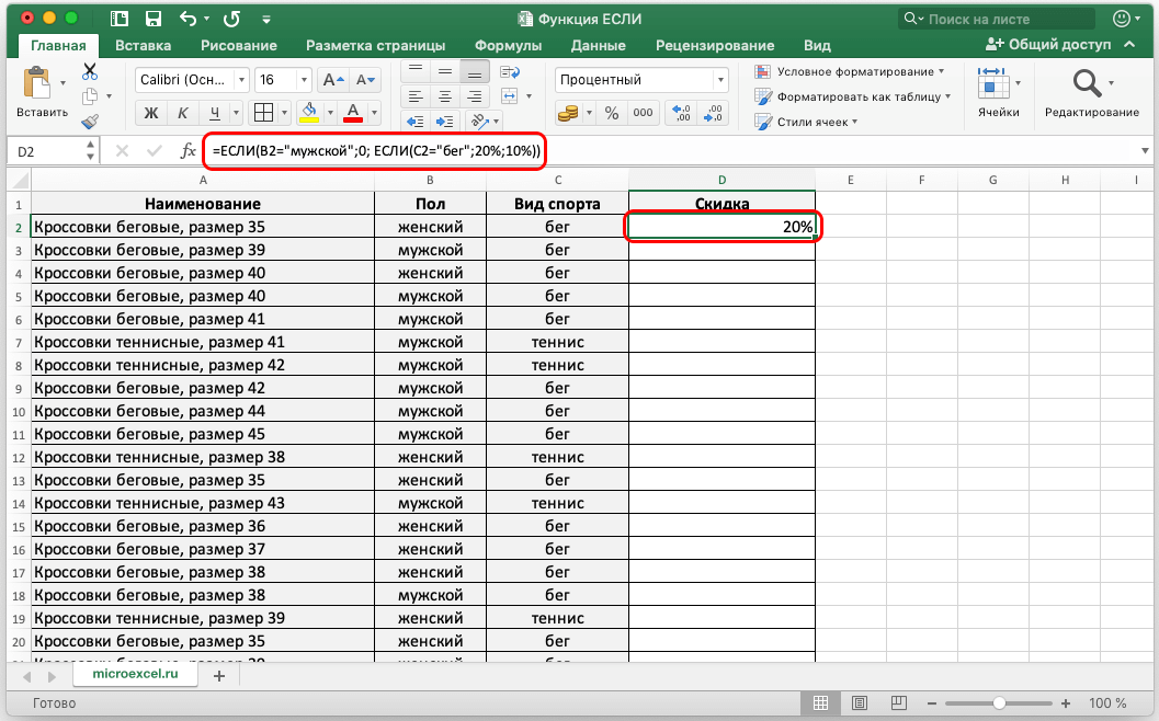 =ЕСЛИ(B2=”мужской”;0; ЕСЛИ(C2=”бег”;20%;10%))