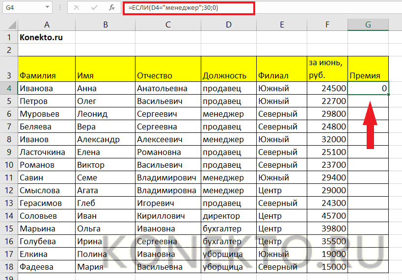 Часто одним условием дело не ограничивается — например, нужно начислить премию только менеджерам, которые работают в Южном филиале компании. Действуем следующим образом: