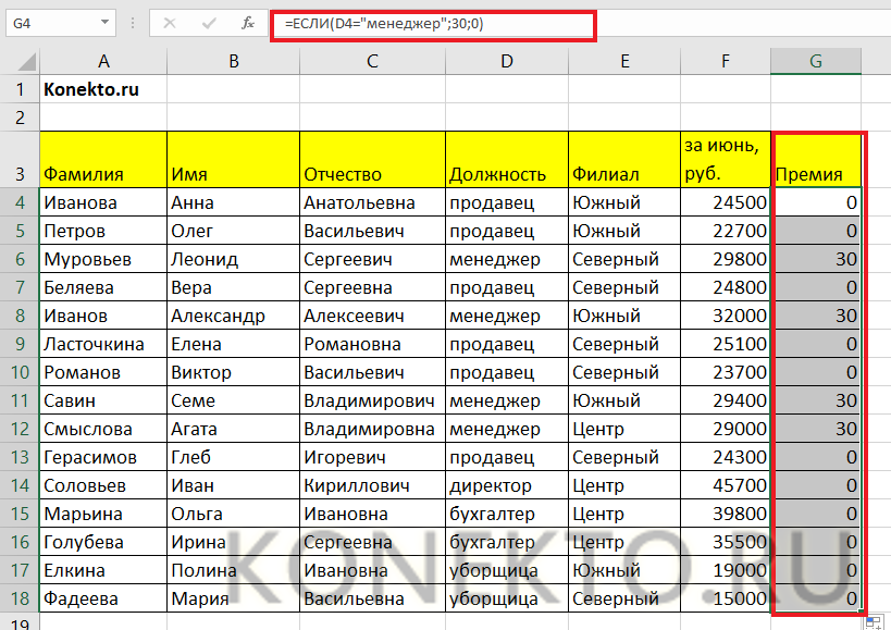 Вот и все — менеджеры получают премию. Воспользовавшись формулой ЕСЛИ, можно быстро сделать выборку нужных сотрудников.