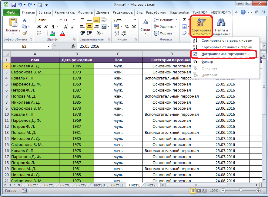 - Открываем меню «Сортировка и фильтр» и выбираем пункт «Настраиваемая сортировка» или «Пользовательская сортировка» (название зависит от версии программы).