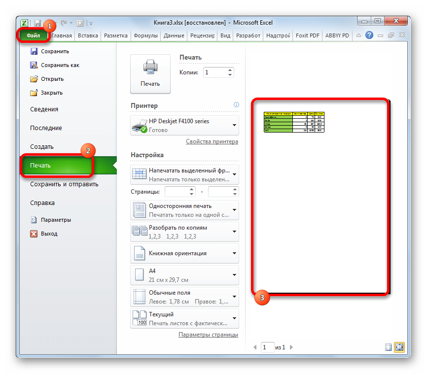 - После выполнения этих действий программа сможет корректно распечатать таблицу в соответствии с нашими пожеланиями. Теперь осталось только перейти в меню Файл, кликнуть по соответствующей кнопке, чтобы отправить документ на печать, предварительно убедившись в том, что выбранные параметры позволили вписать таблицу на один лист.